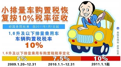 財政部和國家稅務總局聯合發布的《關于1.6升及以下排量乘用車車輛購置稅減征政策到期停止執行的通知》同時指出,對1.6升及以下排量乘用車減按7.5%稅率征收車輛購置稅的政策將于2010年12月31日到期后停止執行。