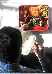 一位鄭州市民在街頭用一次性塑料餐盒吃飯。