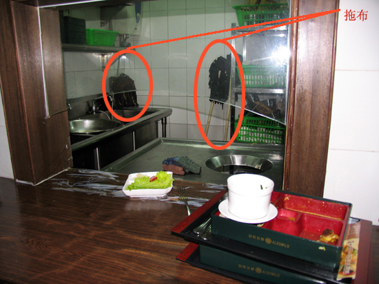 通過一個傳菜的窗口我們看到幾把爛拖布倒放在洗池邊上