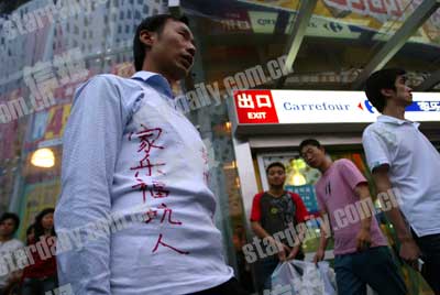記者18時趕到家樂福方莊店時,羅先生身穿白色背心站在超市入口附近,在背心的前后各寫著兩行紅色標(biāo)語:“賣過期啤酒,家樂福坑人。”“這人下午4點多就來了,好像超市沒給解決,所以老是不走。”在附近旁觀的侯先生說。