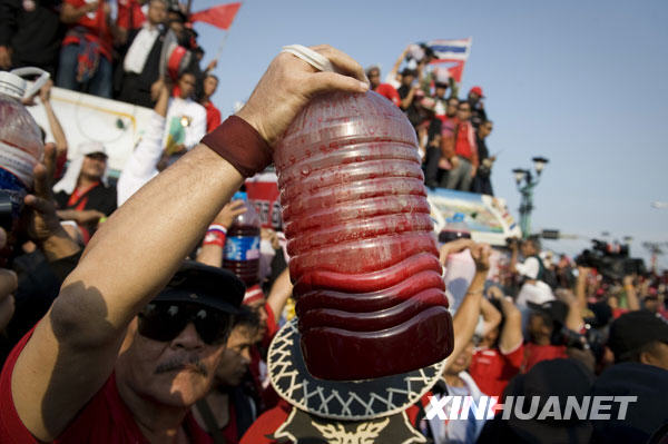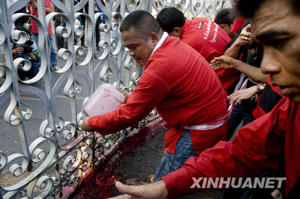 3月16日,在泰國首都曼谷,反政府組織“紅衫軍”成員將血液潑灑在總理府門前。新華社/法新