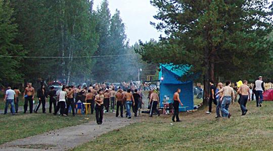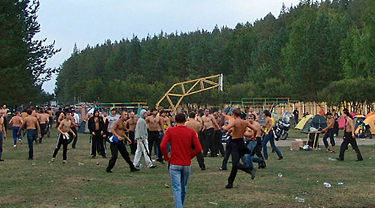29日,俄羅斯米阿斯市,上百名“光頭黨”成員襲擊音樂會現場。他們大多赤裸上身。