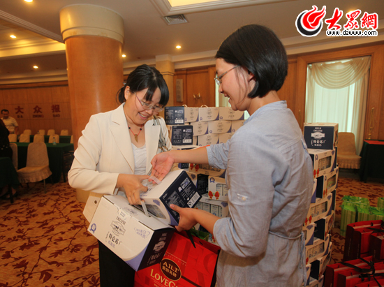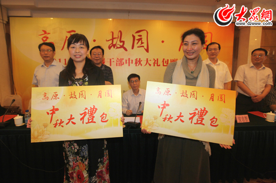 山東援藏干部家屬接過由大眾報業集團贈送的中秋大禮包。