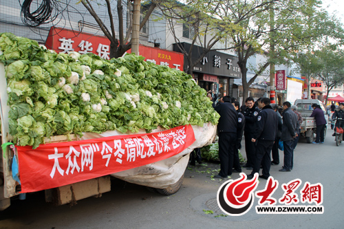 與此同時,本次“愛心菜”銷售的一個更大“戰場”——百花小區銷售點也是被濃濃愛心包圍起來。這里的“大眾網今冬請吃愛心菜直銷車”裝載量大,足足拉來了1.8萬斤大白菜。而直銷車一停在百花小區的東門口,通過大眾網得知賣“愛心菜”消息的愛心市民和愛心單位便紛至沓來。