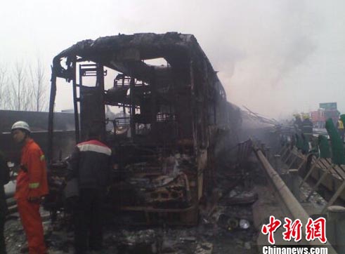 事故現場一輛大客車幾乎被燒毀。邵國棟攝