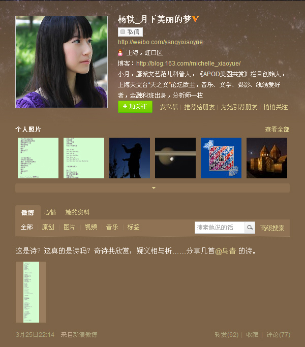 在隨后發(fā)表的微博里,楊軼表示,如果烏青的作品被稱作是詩,那么我們身邊所有形式的語言和文字都是詩,甚至包括夢中的囈語和吃飯時的咀嚼。她更說道,“如果拼湊幾句廢話就能成為‘詩人’,還不如打開電視看廣告。”