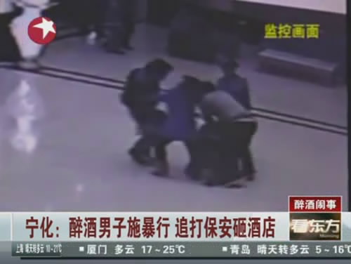監(jiān)控拍下醉酒男子與朋友追打保安砸酒店