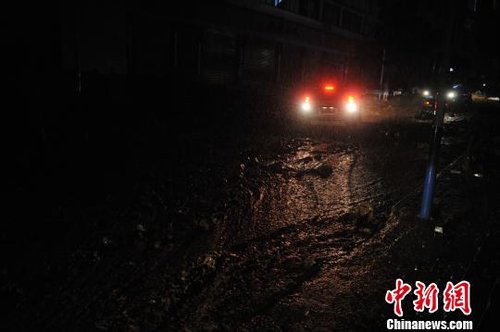 圖為沖到彝良縣城車站街上的泥石流,將道路阻斷。劉冉陽攝