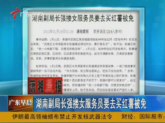 1月14日,常德市武陵區某茶樓副領班趙鐘利在紅網《百姓呼聲》欄目實名舉報,“武陵區水利局副局長張健酒后調戲婦女,暴打服務員”。帖子說,張健還揚言:“我一分錢都不賠,你愿怎樣就怎樣”。1月15日,趙鐘利在紅網發帖表示,稱事情已得到武陵區委、區政府、區紀委領導的高度關注,經雙方調解協商,已得到妥善解決。目前,涉事的副局長張健被免職。
