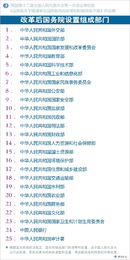 新華網北京3月10日電(記者趙超、崔清新)10日披露的國務院機構改革和職能轉變方案表明,新一輪國務院機構改革即將啟動,國務院組成部門將減少至25個。