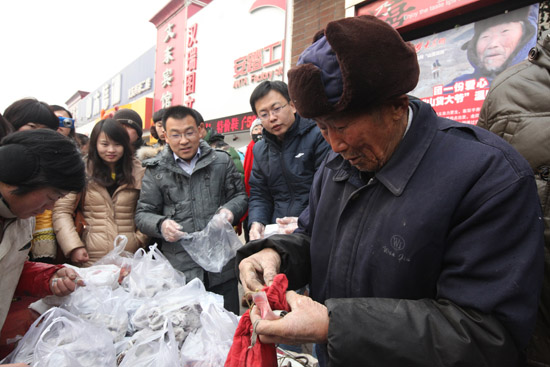 前來采購的熱心市民和網友讓寒冷的天氣變得溫暖:56歲的李阿姨帶來了馬扎,主動維護秩序、裝袋;28歲的林翔帶著朋友,從天橋區開車專門來買貨;正在讀研的馬偉瀚帶來一大杯熱水,為“山貨大爺”驅寒;六乃喜快餐店還專門為老人安排了午飯,為活動制作了大幅海報;山東大學MBA聯合會的6名會員中午1:00就來到了現場,一直幫著“山貨大爺”裝貨、賣貨,他們不僅買了20多斤山貨,還贈送給了“山貨大爺”一個精致的水杯。