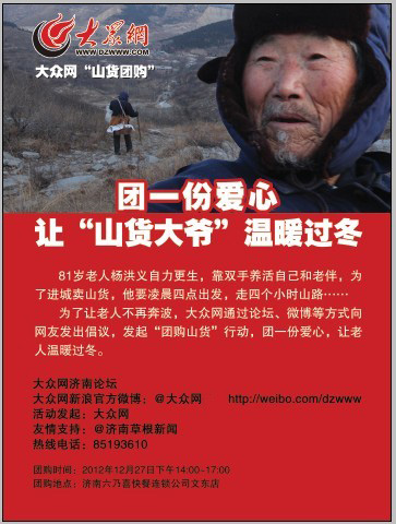 近日, 大眾網連續報道81歲“山貨大爺”步行40里山路進城賣山貨的消息,引起了網友的熱烈關注。在第一次去老人家的采訪中,大眾網記者了解到,老人家里還有300多斤柿餅和一些花椒、山楂片等山貨,老人說從現在起到春節前后,希望把這些山貨慢慢賣完,賣完了不用那么頻繁地走40里山路進城了。為了能讓老人早日賣光家里的山貨,不再遭受奔波之苦,大眾網發起了“團購山貨”行動,團一份愛心,讓老人溫暖過冬。