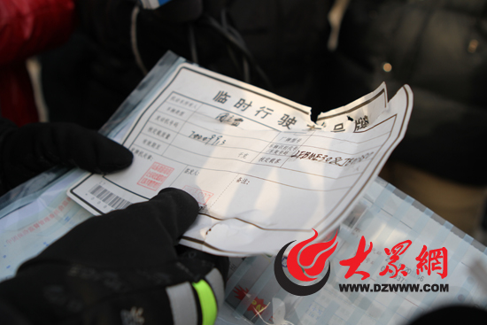 “我買車的時(shí)候,賣車的填好后送給我們的,說是正規(guī)臨牌。”隨車的車主告訴記者,自己于12月26日在聊城購買了新車,取車時(shí)銷售員送給他一套臨時(shí)車牌,并稱此車牌為正規(guī)手續(xù)辦理,“絕對(duì)是真的”。