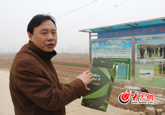 趙彥波向記者村里新推出的老東阿牌有機(jī)韭菜。