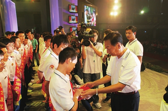 140位“廠星”的大幅照片被擺放在會場外的一條主干道上,家屬們爭相合影。在午宴和晚宴上,郭臺銘走了60多桌,跟每一個人敬酒,親手為優(yōu)秀職工的家屬布菜。他還親自為“廠星”頒獎,時間長達一個小時。