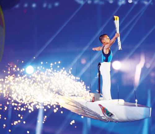 最受關注的當然還是圣火點燃儀式。武漢是體育名城,是全國唯一一個連續六屆奧運會都有運動員獲得金牌的城市,所以,參加這次火炬點燃的都是體壇名將,肖海亮、李婷、韓愛萍、黃俊群、陳靜、喬紅等人依次傳遞,最后將火炬交給11歲的體操小將鄒鑫。鄒鑫雖小,但已經連續兩年在全國少兒體操錦標賽中奪冠,鄒鑫最后飛在空中點燃火炬,預示著幾代運動員薪火相傳,體育事業蓬勃發展。