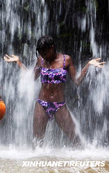 1月23日,在安哥拉城市盧班戈附近的威拉,一名年輕人在瀑布下沐浴嬉戲。新華社/路透