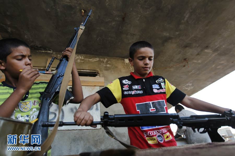 7月12日,在利比亞米蘇拉塔,兩個男孩幫助從茲利坦前線回來的利比亞反對派武裝清潔槍支。 新華社/路透