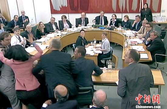 北京時間7月20日凌晨,在英國議會就《世界新聞報》竊聽丑聞質詢默多克父子時,一名男子突然從聽眾席竄起,手拿餐盤,跨過默多克旁邊的人對其襲擊,身后其妻子鄧文迪迅速起身反擊,第一時間抬手準備給襲擊者一巴掌。襲擊者隨后被警方帶走。