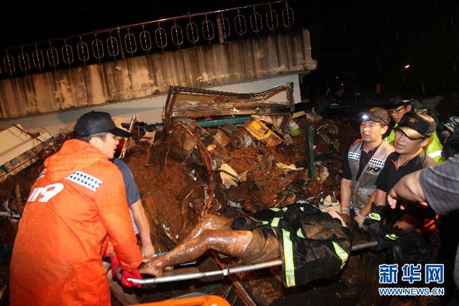 7月27日,在韓國(guó)首都首爾以東約80公里的春川,救援人員在事故現(xiàn)場(chǎng)施救。當(dāng)日,一場(chǎng)強(qiáng)暴雨襲擊該國(guó)南部山區(qū),引發(fā)泥石流。災(zāi)難已經(jīng)造成9人死亡,2人失蹤。 新華社/法新
