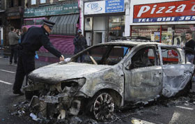 英國發生的騷亂不僅在倫敦市內多個地區蔓延,而且向伯明翰和利物浦等城市擴散。經歷連續三晚的街頭騷亂后,英國警方大幅加強倫敦警力。8月9日在倫敦街頭執勤的警察達到約16000人,為平時的5倍,并將持續3天。 新華社/路透