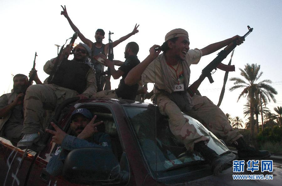 8月21日,利比亞反對派武裝乘坐汽車通過馬伊耶,向的黎波里郊區進發。利比亞反對派官員當日稱卡扎菲長子穆罕默德·卡扎菲已向反對派投降。新華社/路透