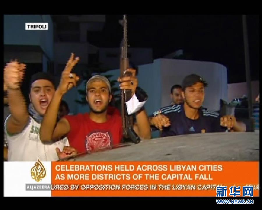 這張半島國際電視臺8月22日的電視截圖顯示,利比亞反對派在首都的黎波里慶祝。利比亞“全國過渡委員會”委員阿卜杜拉·邁胡卜22日宣布,反對派武裝已經控制首都的黎波里,目前正在市內清除卡扎菲殘余部隊。利比亞反對派官員確認,卡扎菲長子穆罕默德·卡扎菲已向反對派投降,次子賽義夫·卡扎菲被捕。新華社發