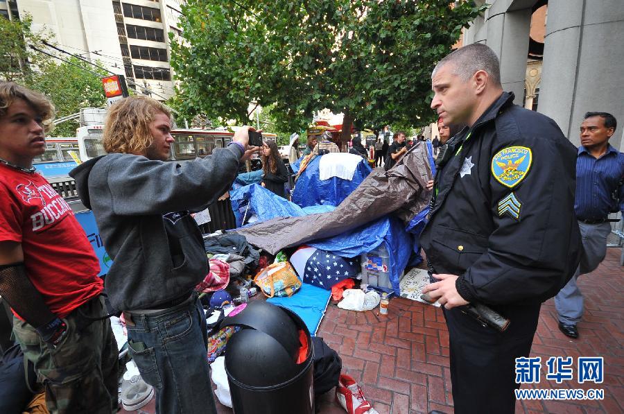10月11日,在美國舊金山聯邦儲備銀行前,一名抗議者用手機拍攝正在執勤的警察。于10月6日被舊金山警察局以“沒有在公共地方長期逗留的許可證”為由驅散的“占領舊金山”抗議者10月10日又重返舊金山聯邦儲備銀行門前扎營,他們表示將不再離開,同時也在物色其他地點,擴大抗議規模。警方則在聯邦儲備銀行一帶加強警戒。新華社發(劉藝霖攝)