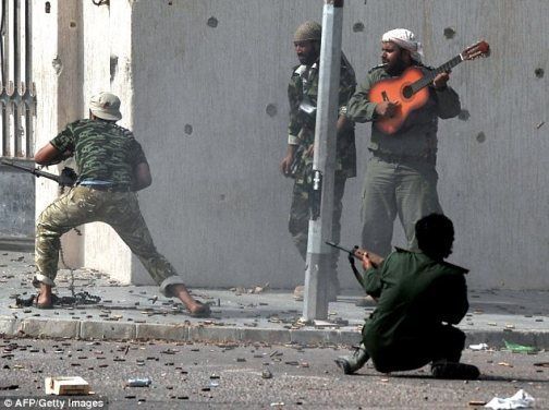 在卡扎菲家鄉蘇爾特,利比亞當局武裝士兵正與效忠卡扎菲的部隊激烈交火,戰場上一名男子淡定彈奏吉他引人注目。