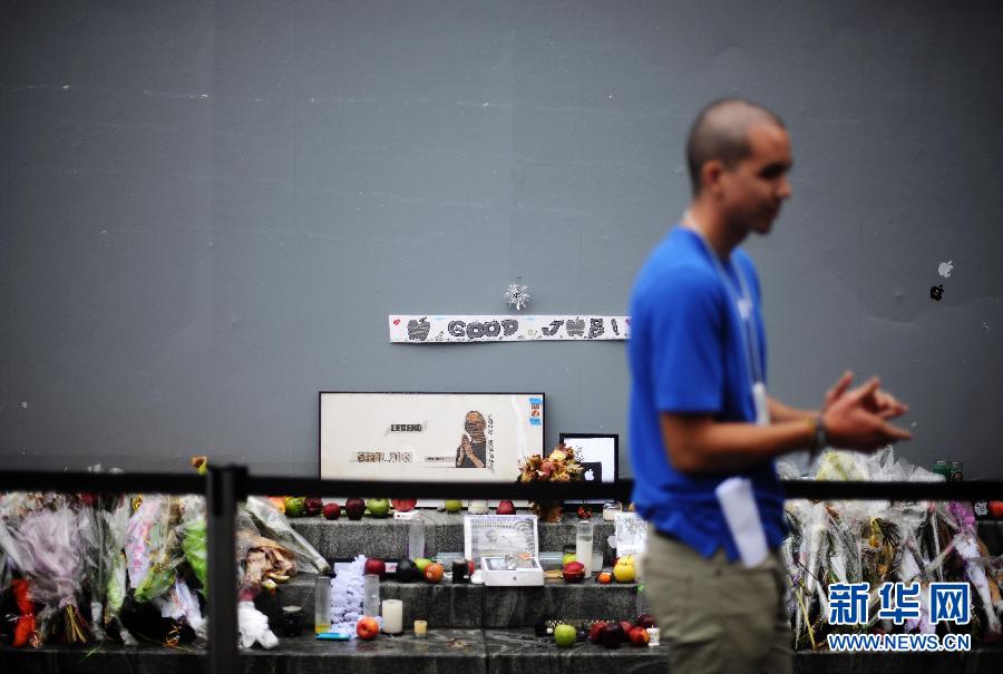 10月14日,在美國紐約曼哈頓第五大道蘋果公司旗艦店外,一名蘋果店的員工站在悼念蘋果公司創(chuàng)始人喬布斯的花束和蘋果旁鼓掌歡迎前來購買iPhone 4S的顧客。 當(dāng)日,蘋果公司新款手機iPhone 4S在美國、澳大利亞、加拿大、法國、德國、日本和英國正式上市,并于10月底前銷往其他22個國家和地區(qū)。 新華社記者申宏攝