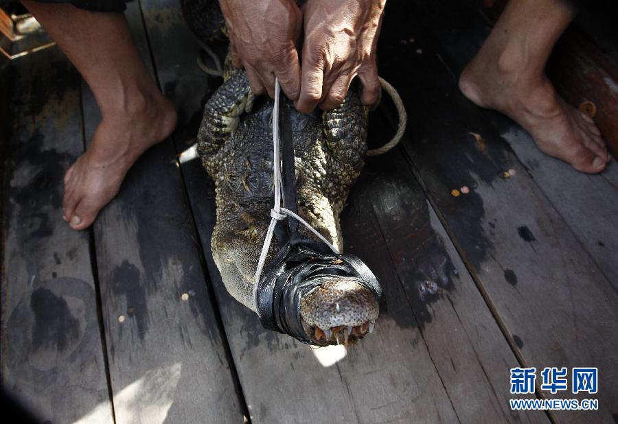 泰國救援人員在泰國大城府省的洪災區捕獲一只鱷魚。截至15日,泰國持續兩個多月的洪災已造成297人死亡、2人失蹤。 新華社/路透