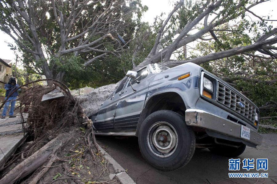 12月1日,在美國加利福尼亞州洛杉磯,被風吹倒的大樹壓在車上。