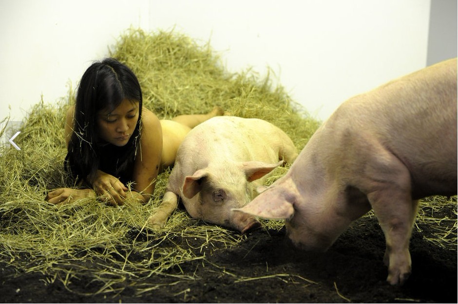 行為藝術家玩另類:與豬裸睡