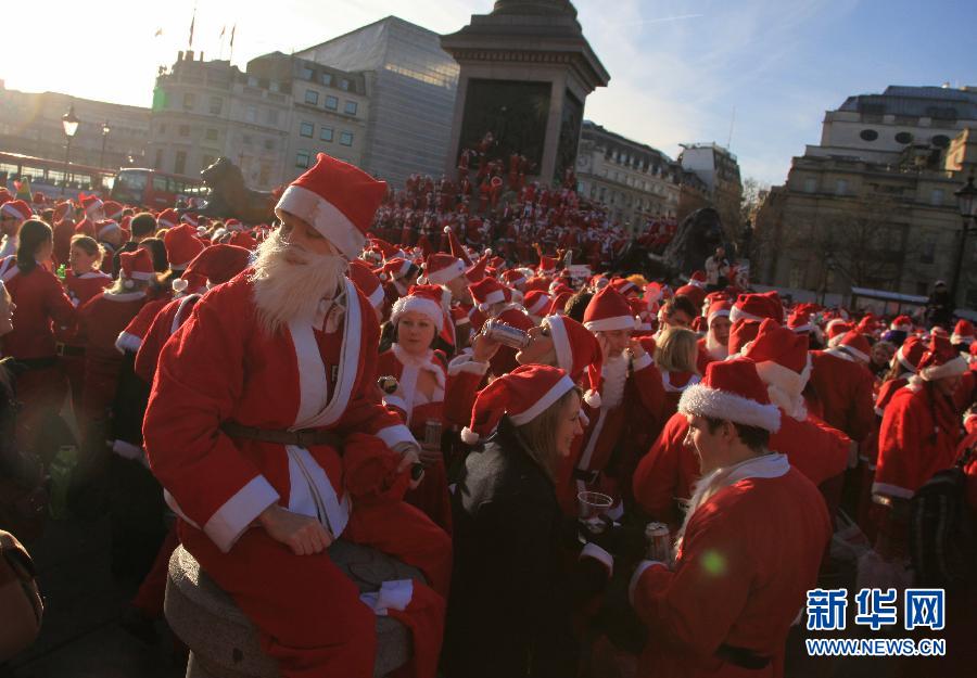 12月10日,在英國首都倫敦,打扮成圣誕老人的狂歡者們聚集在特拉法加廣場。當天,倫敦舉行一年一度的圣誕老人狂歡,上千名打扮成圣誕老人的狂歡者聚集在此,慶祝即將到來的圣誕節。 新華社發(相梅攝)