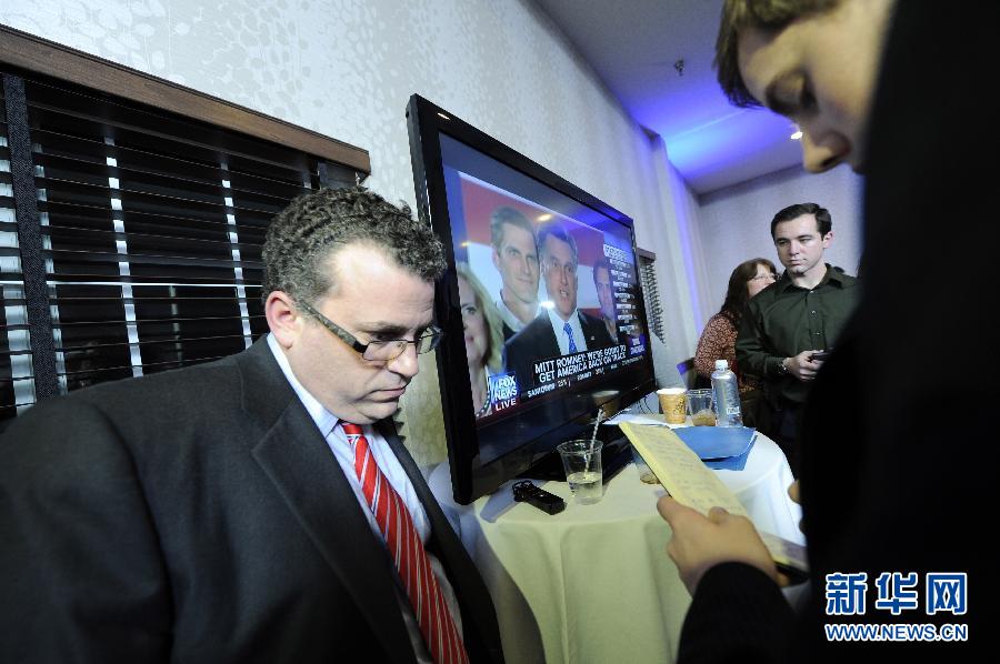 1月3日,在美國(guó)艾奧瓦州首府得梅因附近,人們觀看美國(guó)共和黨總統(tǒng)競(jìng)選人、前馬薩諸塞州州長(zhǎng)米特·羅姆尼講話直播。當(dāng)晚,在艾奧瓦州舉行的美國(guó)總統(tǒng)選舉共和黨首場(chǎng)黨內(nèi)預(yù)選中,前馬薩諸塞州州長(zhǎng)米特·羅姆尼以8票戰(zhàn)勝前賓夕法尼亞州聯(lián)邦參議員里克·桑托勒姆,獲得勝利。新華社記者張軍攝