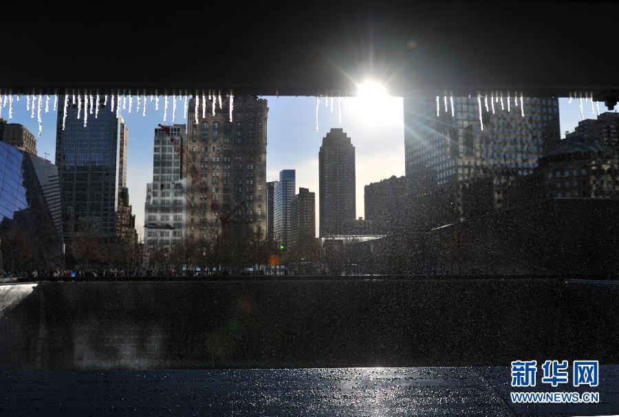 1月4日,來自世界各地的參觀者冒嚴寒在美國紐約世貿中心遺址紀念館水池前憑吊逝者。