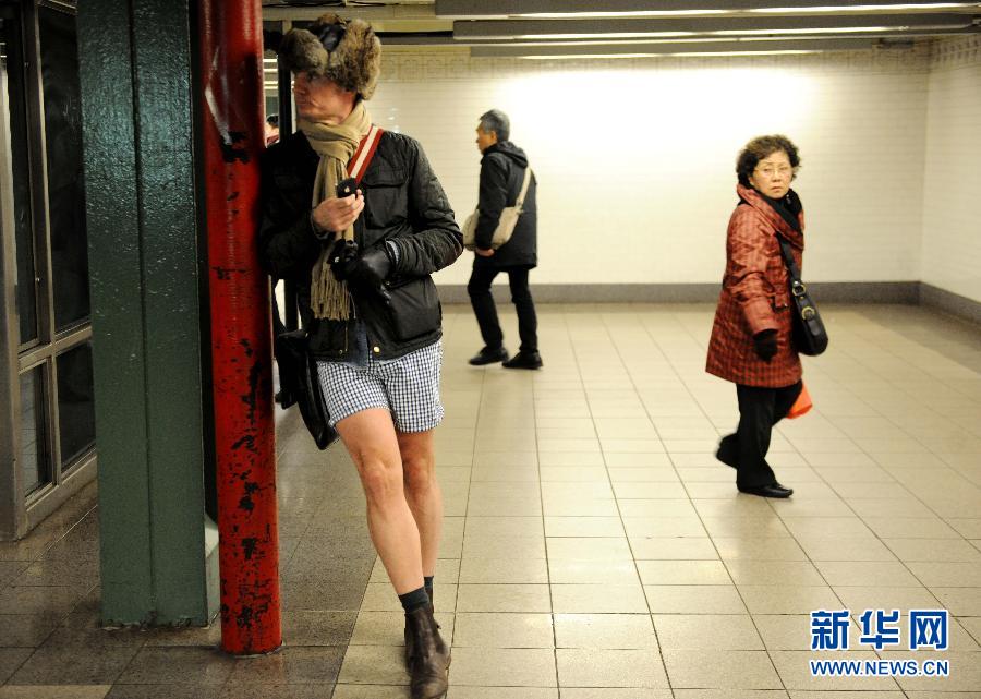 1月8日,一名男士在美國紐約一個地鐵站內參加“不穿褲子搭地鐵”活動。當日,名為“到處即興表演”的團體在世界多個城市舉行第11屆“不穿褲子搭地鐵”活動,數千名紐約民眾參與其中。 新華社記者申宏攝