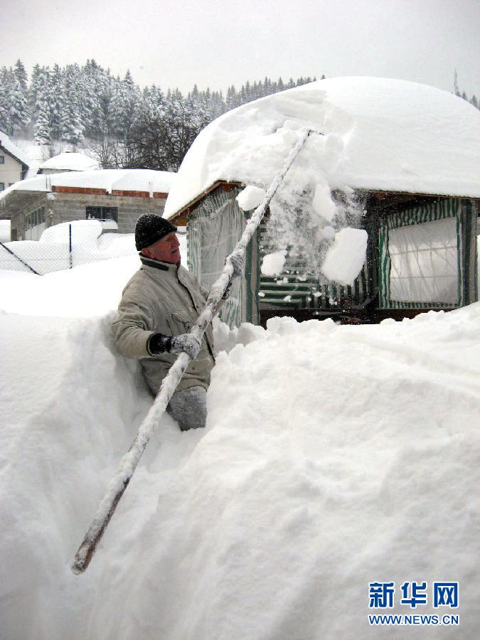1月27日,在塞爾維亞西南部新瓦羅什地區,一位居民在清理積雪。