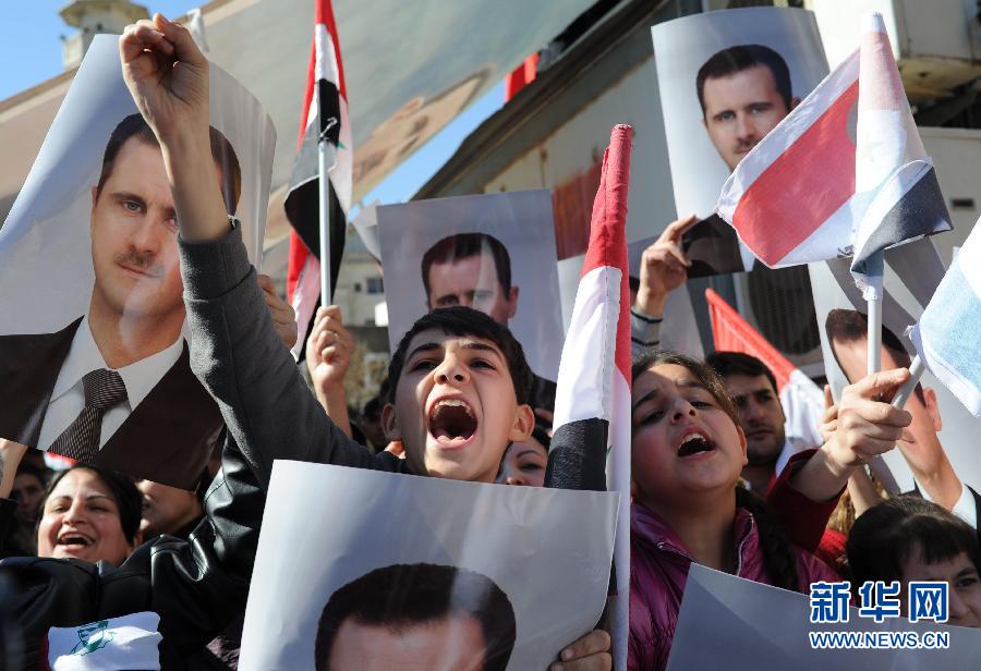 2月5日,在敘利亞首都大馬士革的七湖廣場,政府支持者參加集會活動。當日,近千敘利亞政府支持者聚集在首都大馬士革的七湖廣場,要求政府采取措施,盡快結束目前的動蕩局面。 新華社記者覃海石攝