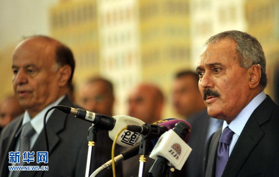 2月27日,在也門首都薩那總統府,也門卸任總統薩利赫(右)在新總統阿卜杜勒-拉布·曼蘇爾·哈迪(左)的就職典禮上講話。當日上午,也門卸任總統薩利赫在新總統阿卜杜勒-拉布·曼蘇爾·哈迪的就職典禮上正式將權力移交給哈迪。2011年1月底,也門各省陷入動蕩。同年11月,時任總統薩利赫與海灣阿拉伯國家合作委員會簽署調解協議。2012年2月21日,也門舉行總統選舉。副總統哈迪作為唯一候選人參選,獲得超過600萬張選票,以99.8%的得票率當選為新一任總統。新華社發(默罕默德攝)