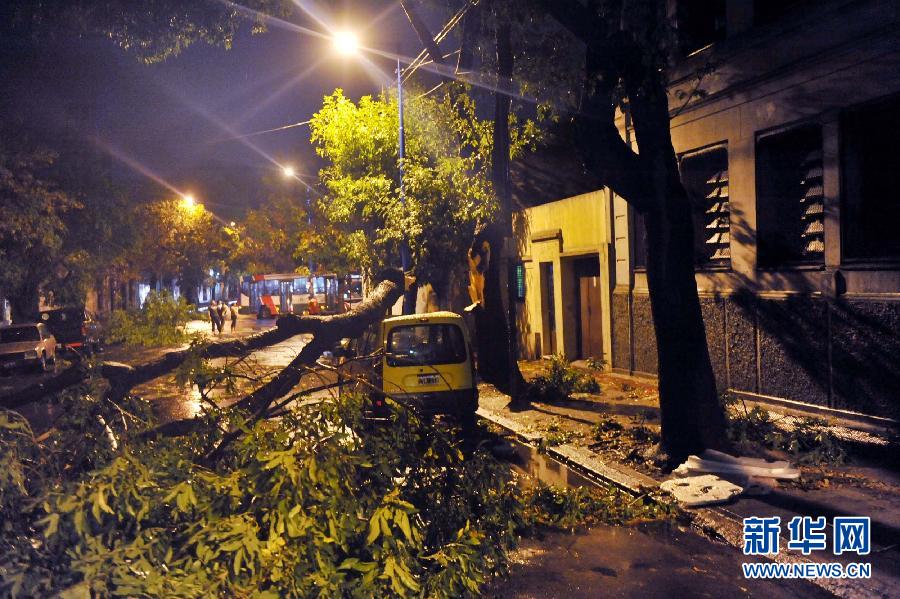 4月4日,在阿根廷首都布宜諾斯艾利斯,被風刮倒的大樹橫在路上。布宜諾斯艾利斯當天遭暴風雨襲擊,大量樹木和廣告牌被刮倒,地鐵運行中斷,部分地區斷電。新華社/美洲通訊社