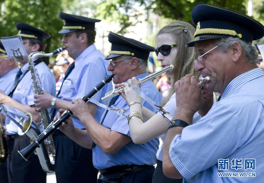 5月1日,在克羅地亞首都薩格勒布的馬科西米爾公園,由公交公司工人志愿者組成的樂隊給民眾演奏,慶祝“五一”國際勞動節。 新華社發(米紹·利沙寧攝)