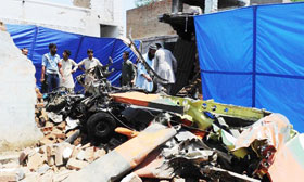 5月21日,在也門首都薩那,也門安全部隊人員在爆炸現場清理殘骸。
