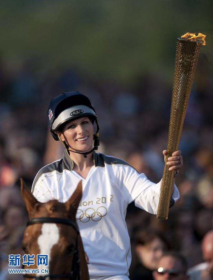 5月23日,扎拉·菲利普在火炬傳遞中。當日,女王伊麗莎白二世的外孫女扎拉·菲利普斯在切爾滕納姆賽馬場參加倫敦奧運會火炬傳遞活動。新華社/路透