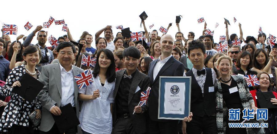 5月30日,一起出席活動的中國電視主持人何炅(前排右二)、李維嘉(前排中)、跳水奧運冠軍李娜(前排左三)、新東方聯合創始人徐小平(前排左二)與湖南衛視《快樂大本營》節目制片人龍梅(前排左一)與倫敦發展促進署倫敦教育局主任凱文·麥卡錫(前排右三)在倫敦市政廳前合影。當日,在英國倫敦泰晤士河畔,來自100多個國家和地區的295名學生把學士帽扔向天空,也拋起了一項新的吉尼斯世界紀錄。這項“有最多學生參與的拋學士帽活動”是倫敦今年以來創下的第14項吉尼斯世界紀錄,這一舉動意在慶祝英國留學生人數的增加。截至目前,倫敦的留學生人數已經超過10.8萬,其中中國留學生大約11000人。新華社記者王麗莉攝