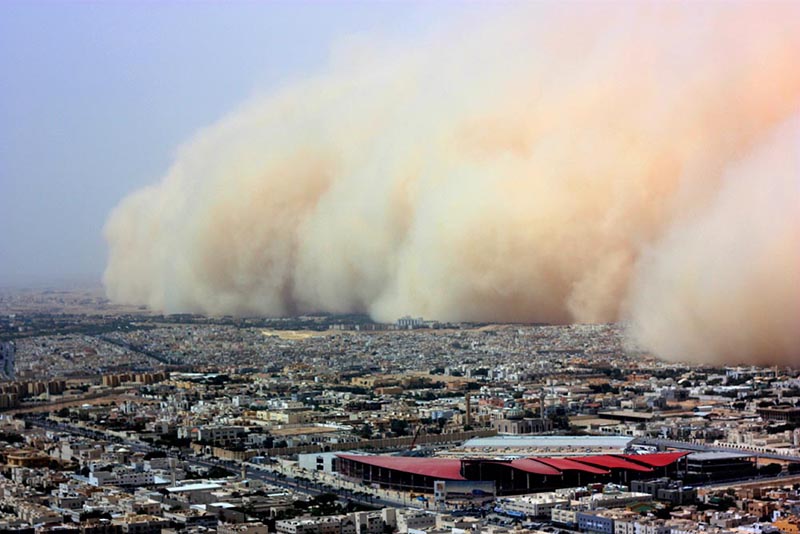 沙塵暴是沙暴和塵暴兩者兼有的總稱,是指強風把地面大量沙塵物質吹起并卷入空中,使空氣特別混濁,水平能見度小于一千米的嚴重風沙天氣現象。其中沙暴系指大風把大量沙粒吹入近地層所形成的挾沙風暴;塵暴則是大風把大量塵埃及其它細粒物質卷入高空所形成的風暴。