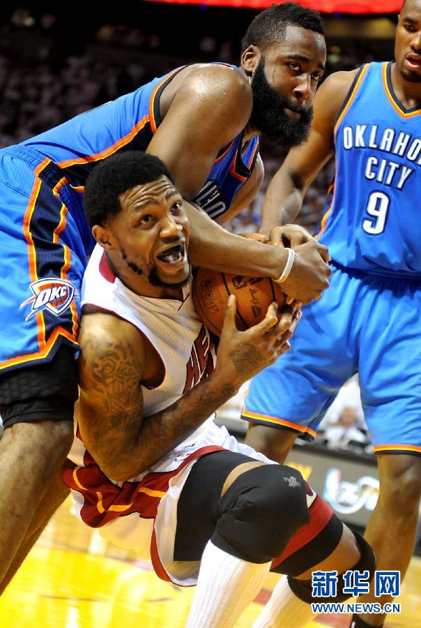 6月19日,熱火隊球員哈斯勒姆(下)與雷霆隊員哈登(左上)拼搶。當日,在2011-2012賽季NBA總決賽第四場比賽中,邁阿密熱火隊主場以104比98戰勝俄克拉荷馬雷霆隊。邁阿密熱火隊目前以3比1的總比分領先。新華社記者王雷攝