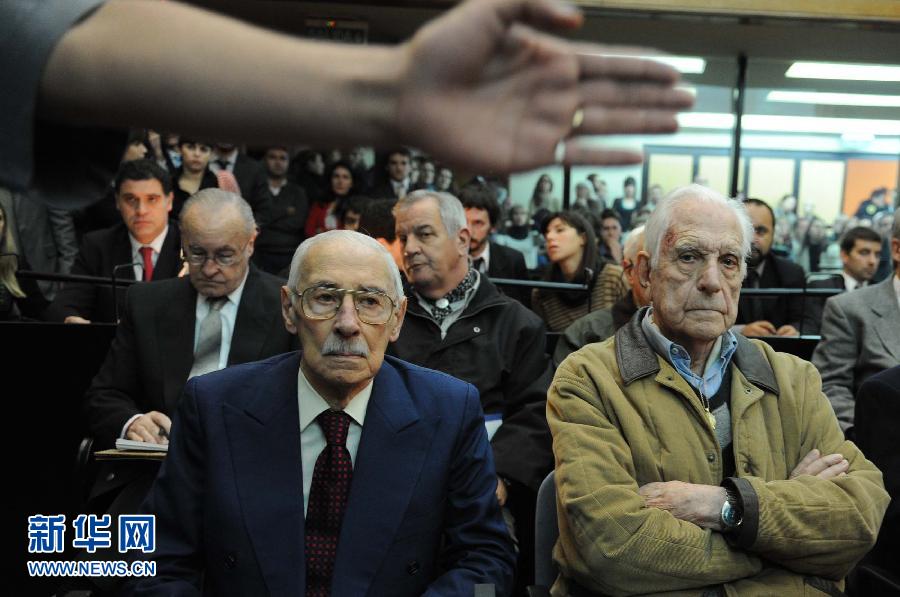7月5日,在阿根廷首都布宜諾斯艾利斯,阿前總統魏地拉(前左)和比尼奧內(前右)在法庭聽候宣判。阿根廷多名前獨裁政權高級軍政官員盜走數百名在押人員的子女,交由他人收養。案件從立案到庭審歷時14年,法庭當日分別判處兩名前總統50年和15年監禁。新華社/美洲通訊社