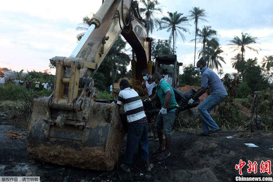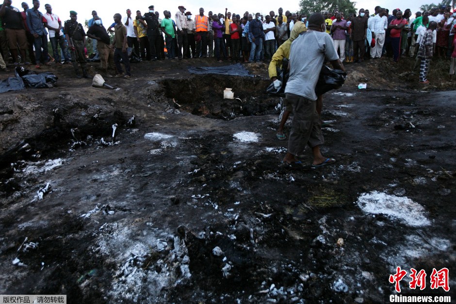 當(dāng)?shù)貢r(shí)間2012年7月12日,尼日利亞哈科特港,一輛運(yùn)送汽油的車(chē)輛發(fā)生事故并引發(fā)大火,目前已造成至少95人死亡。圖為救援人員在搬運(yùn)遇難者。