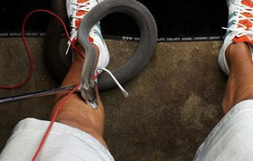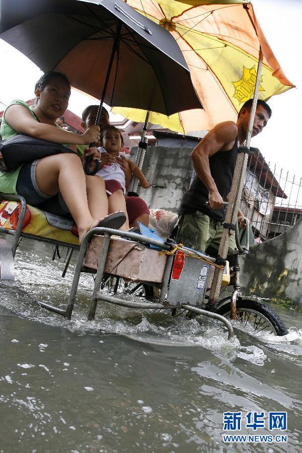 8月1日,在菲律賓大馬尼拉地區(qū)納沃塔斯市,市民在洪水中騎行。